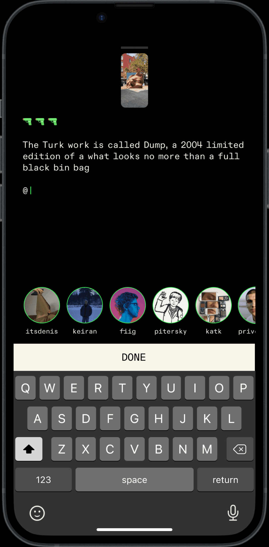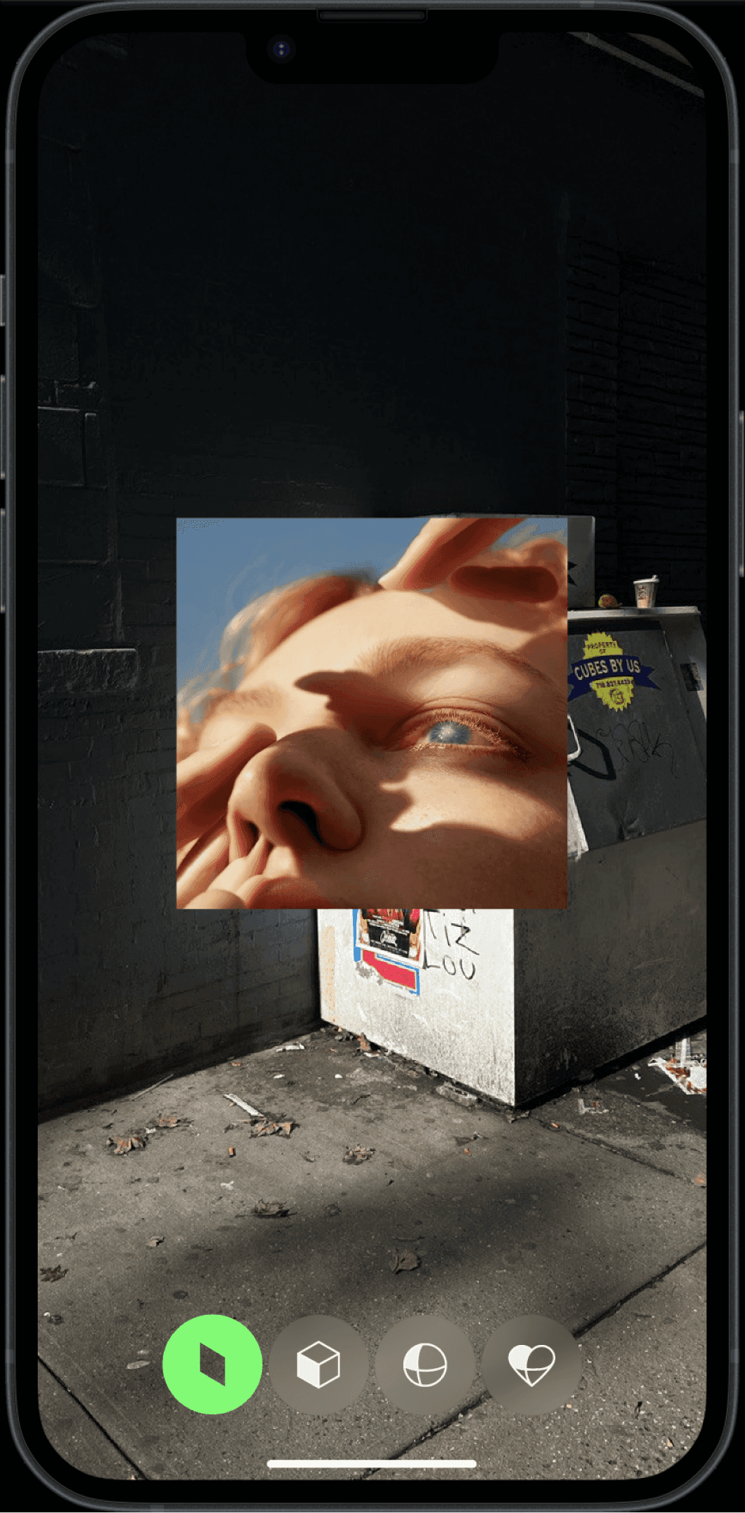 Transferring the experience from the digital space to the real world proved to be a challenging task. We reimagined and reinvented every element of a classic social network to create a modern, engaging experience that remains honest to the user. One of the features we developed from scratch is an AR editor that allows users to add various media formats in different quantities, modify them, and publish. The user profile reflects their daily life and creative activity through a prominent user pic and a central map element, showing which areas they frequent and who visits their posts. Several researches were conducted, and the results formed the basis for the MVP and future iterations.